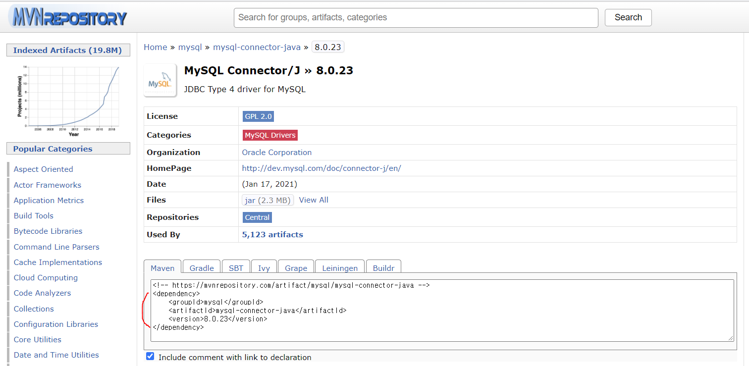 mvnrepository.com/artifact/mysql/mysql-connector-java - 원하는 Version 클릭 ( 8.0.23 버전 사용 )