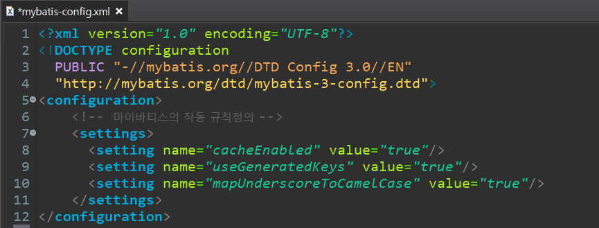 <!-- 마이바티스의 작동 규칙정의 mysql은 useGeneratedKeys value가 반드시 true여야 한다-->